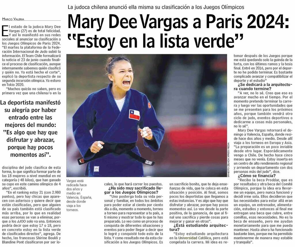Las Últimas Noticias entrevista a la judoca Mary Dee Vargas, estudiante de Arquitectura UC, sobre su clasificación a los Juegos Olímpicos de Paris 2024.