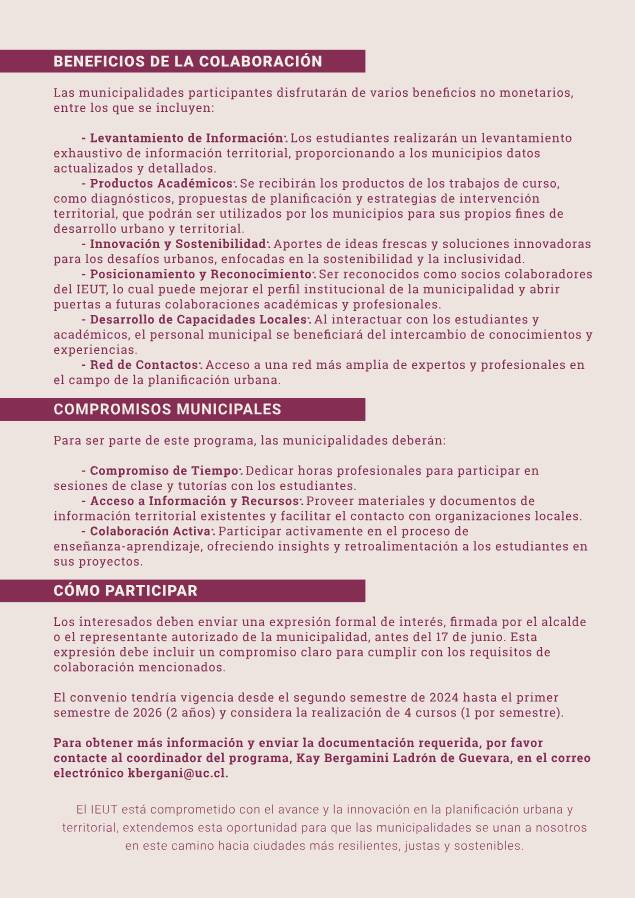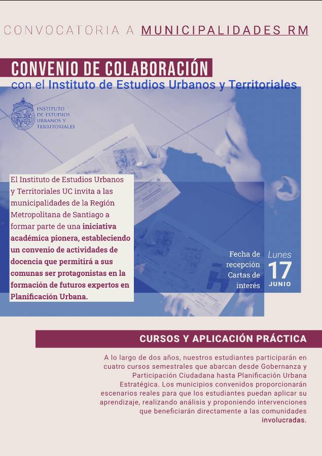 El Instituto de Estudios Urbanos y Territoriales (IEUT) de la Pontificia Universidad Católica de Chile se complace en invitar a las municipalidades de la Región Metropolitana de Santiago a formar parte de una iniciativa académica pionera, estableciendo un convenio que permitirá a sus comunas ser protagonistas en la formación de futuros expertos en Planificación Urbana.