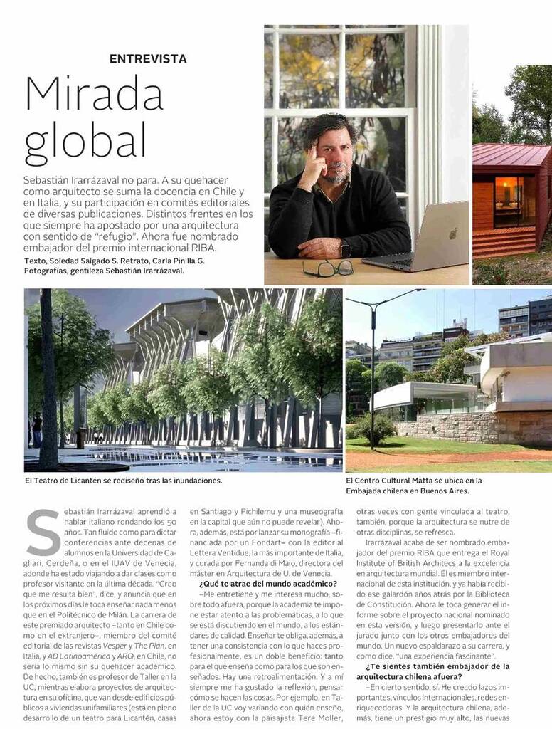 VD de El Mercurio entrevista al arquitecto Sebastián Irarrázaval, miembro del comité editorial de las revistas Vesper y The Plan, en Italia, y AD Latinoamérica y ARQ, en Chile, y profesor UC, que acaba de ser nombrado embajador del premio internacional RIB, que entrega el Royal Institute of British Architecs a la excelencia en arquitectura mundial.