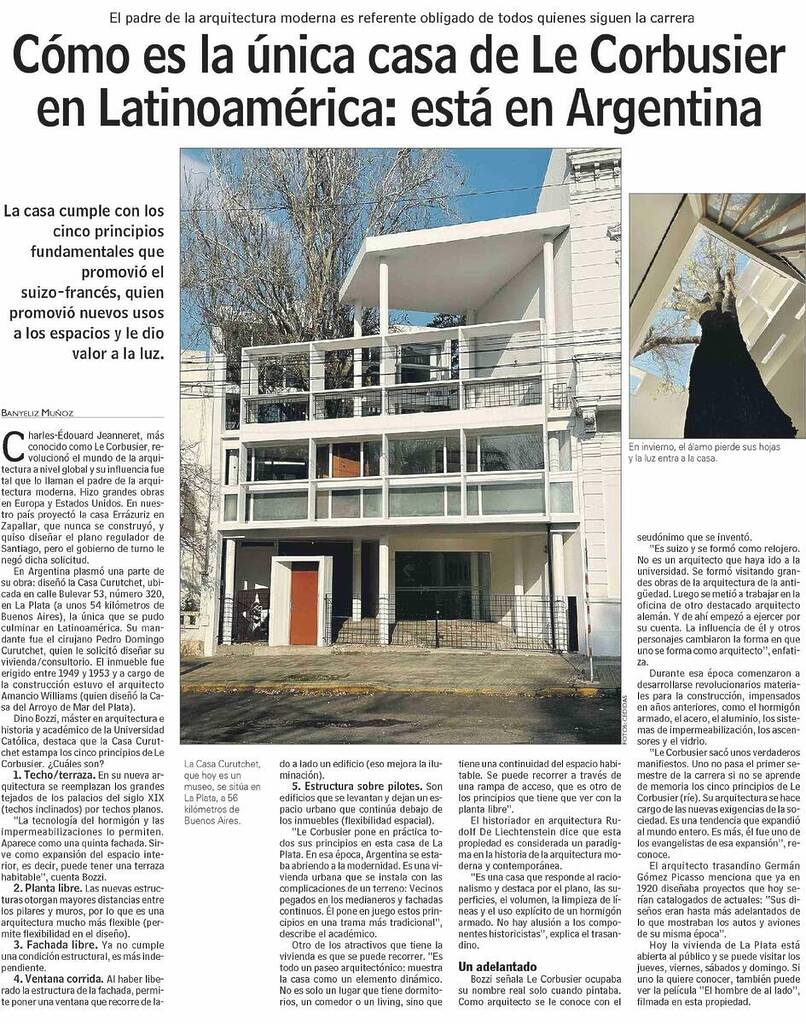 Las Últimas Noticias destaca cómo es la única casa de Le Corbusier en Latinoamérica, que está emplazada en Argentina. Habla el académico de la escuela de Arquitectura Dino Bozzi.