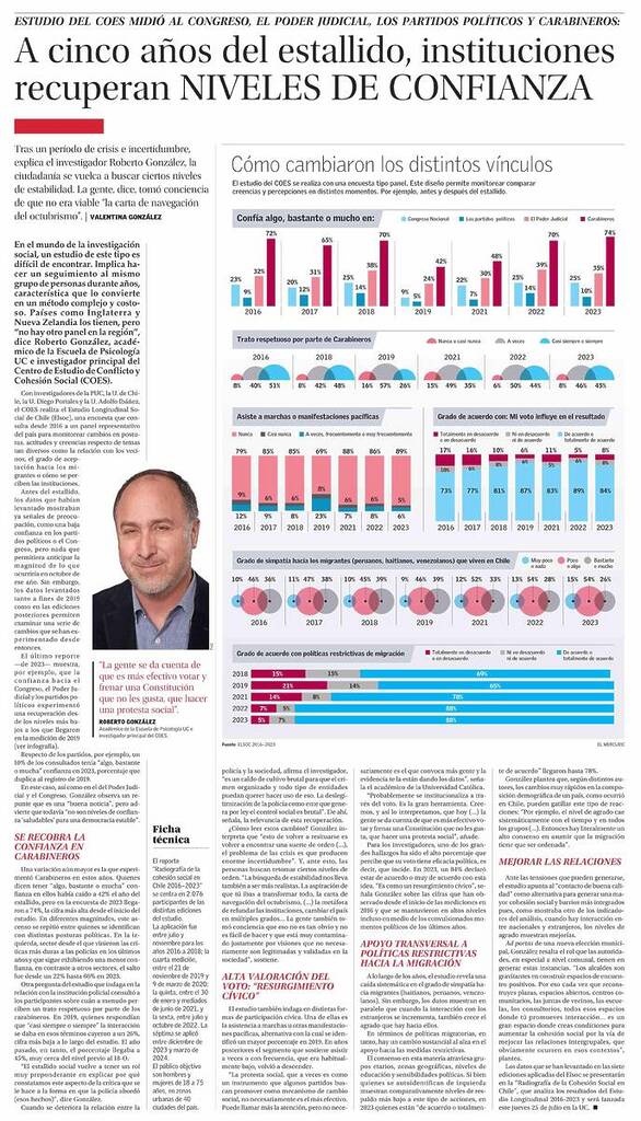 Reportajes de El Mercurio destaca que el Estudio Longitudinal Social de Chile (Elsoc) muestra que a cinco años del estallido, instituciones recuperan niveles de confianza. El estudio midió al Congreso, el Poder Judicial, los partidos políticos y Carabineros. Participaron investigadores de la UC, la U. de Chile, la U. Diego Portales y la U. Adolfo Ibáñez. Habla Roberto González, académico de la Escuela de Psicología UC e investigador del Coes.