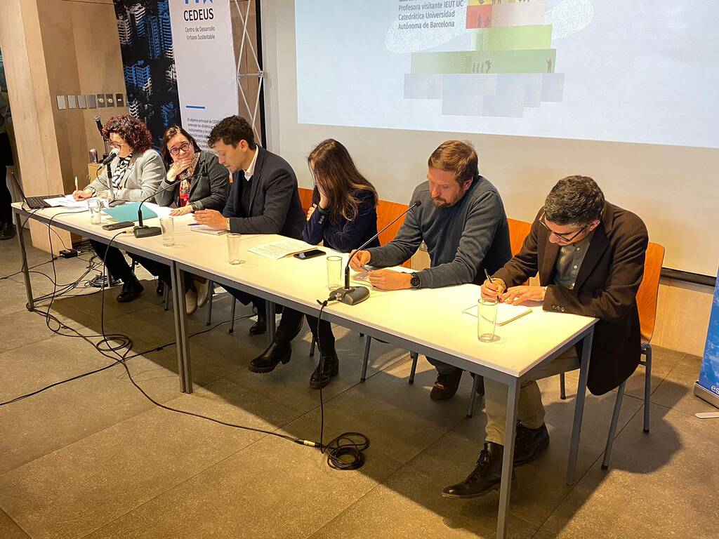 Luego de los saludos protocolares de las autoridades presentes en el seminario, la catedrática y profesora invitada del IEUT, Carme Miralles, realizó una conferencia sobre cambio climático y ciudad, que fue seguido de un conversatorio en el que participaron el jefe de la división de Desarrollo Urbano del Ministerio de Vivienda y Urbanismo, Vicente Burgos; la directora de Investigación y Postgrado FADEU, Magdalena Vicuña; el profesor UC e investigador CEDEUS, Ricardo Hurtubia; el profesor del IEUT y también investigador CEDEUS, Giovanni Vecchio; y la profesora IEUT e investigadora CEDEUS, Carolina Rojas, quien ejerció como moderadora de la instancia.