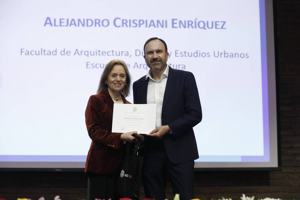 En el caso de la FADEU fueron reconocidos tres académicos: Alejandro Crispiani (escuela de Arquitectura) y Marcela Parada (escuela de Diseño) por cumplir 25 años de trayectoria docente; y Fernando Pérez (escuela de Arquitectura) por cumplir 50 años dedicados a la función académica en la UC.