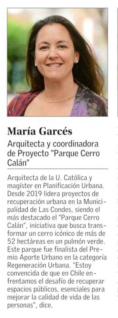 María Garcés trabaja actualmente en la Ilustre Municipalidad de Las Condes, y ha sido reconocida por su trabajo en el Parque Cerro Calán.