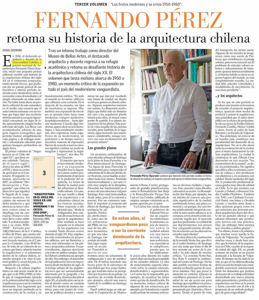 Artes y Letras de El Mercurio destaca que el arquitecto, profesor UC y premio nacional de Arquitectura, Fernando Pérez Oyarzún, publica el tercer volumen de su historia de la arquitectura chilena del siglo XX: Los frutos modernos y su crisis 1950-1980. De Ediciones ARQ, de la UC, el libro será lanzado mañana, en el Campus Lo Contador.