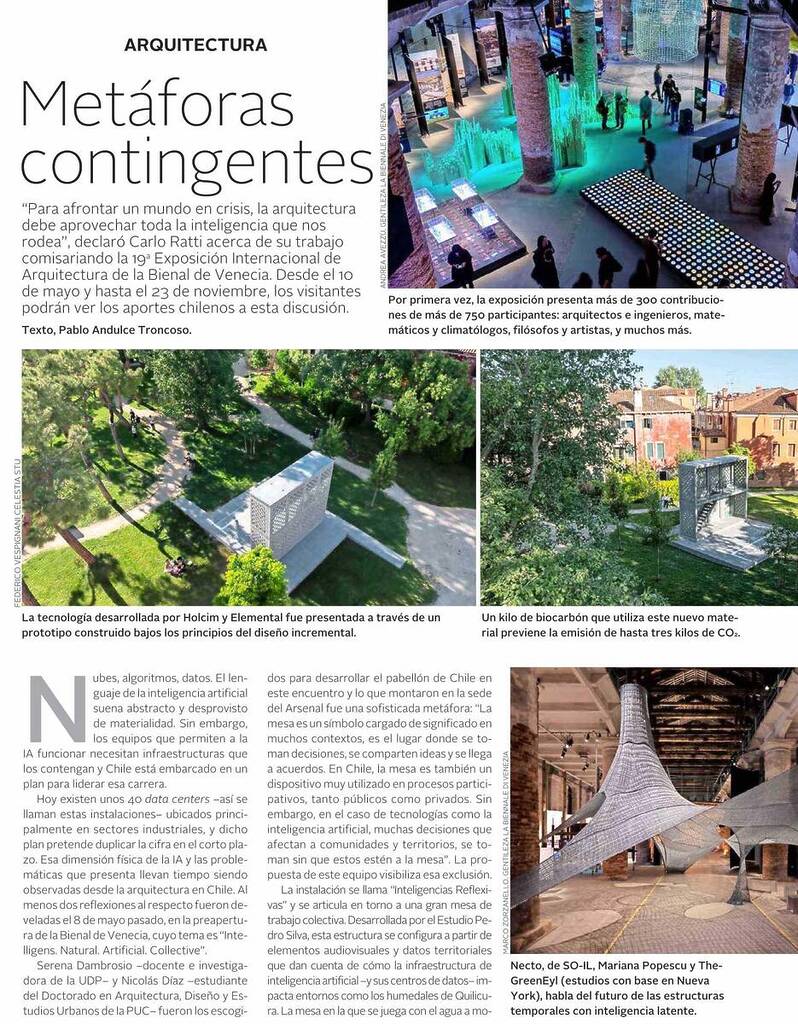 Se destaca la presencia de Chile en la 19a Exposición Internacional de Arquitectura de la Bienal de Venecia, desde el 10 de mayo y hasta el 23 de noviembre, cuyo tema es “Intelligens. Natural. Artificial. Collective”. Serena Dambrosio, académica de la U. Diego Portales, y Nicolás Díaz, estudiante del Doctorado en Arquitectura, Diseño y Estudios Urbanos UC, fueron los escogidos para desarrollar el pabellón de Chile en este encuentro.