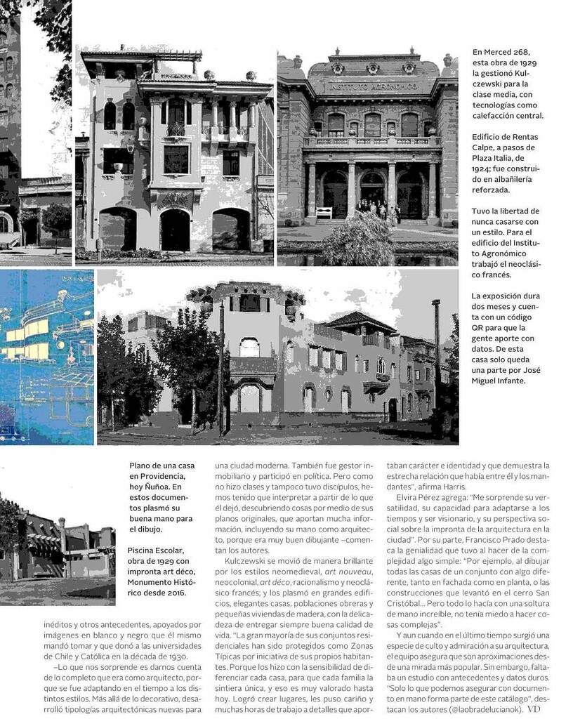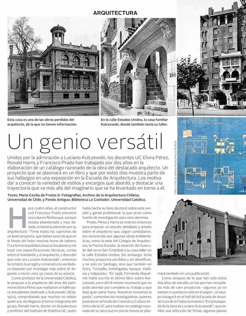 Revista VD de El Mercurio destaca que los profesores UC Elvira Pérez, de Arquitectura; Ronald Harris, del Instituto de Estética, y Francisco Prado, de la Escuela de Construcción Civil, trabajan en la elaboración de un catálogo de la obra del destacado arquitecto Luciano Kulczewski con el apoyo del fondo de Creación y Cultura Artística de la UC. El proyecto se plasmará en un libro y muestra parte de sus hallazgos en una exposición en la Escuela de Arquitectura.