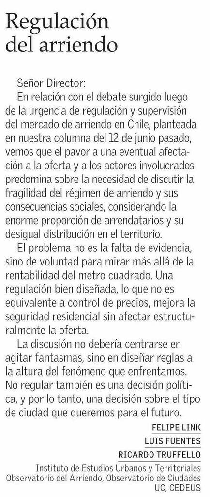 Diario El Mercurio publica una carta al director de los profesores del Instituto de Estudios Urbanos y Territoriales Felipe Link, Luis Fuentes y Ricardo Truffello.