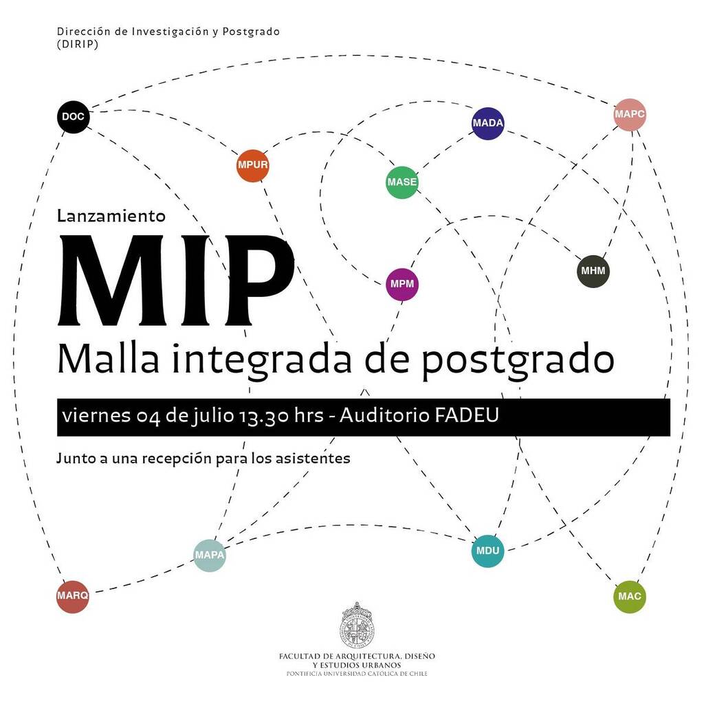 El próximo viernes 4 de julio, a las 13:30 horas, en el auditorio FADEU, se llevará a cabo el lanzamiento de la Malla Integrada de Postgrado (MIP) de la Facultad de Arquitectura, Diseño y Estudios Urbanos, iniciativa conducida por la Dirección de Investigación y Postgrado del Decanato.