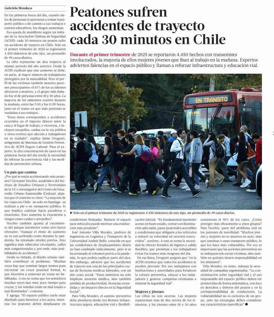 La Tercera destaca que un informe de la Asociación Chilena de Seguridad (ACHS) revela que cada 30 minutos un peatón sufre un accidente de trayecto en Chile. Al respecto, se entrevista al profesor del Instituto de Estudios Urbanos y Territoriales, e investigador CEDEUS, Giovanni Vecchio.