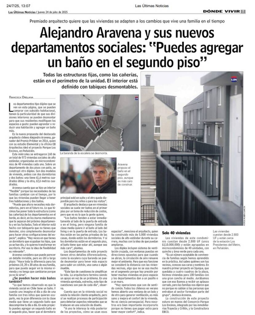 Diario Las Últimas Noticias publica noticia con los nuevos departamentos sociales diseñados por el arquitecto, premio Pritzker, y profesor de la escuela de Arquitectura, Alejandro Aravena.