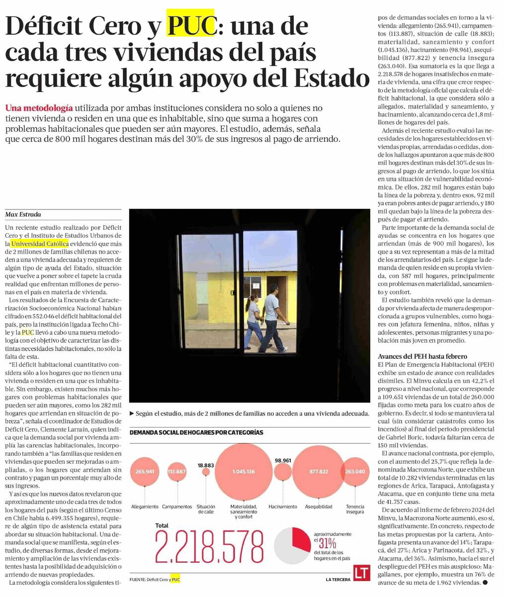 PRENSA I Medios destacan que estudio realizado por Déficit Cero y el Instituto de Estudios Urbanos revela que una de cada tres familias no cuenta con una vivienda adecuada y requiere apoyo estatal