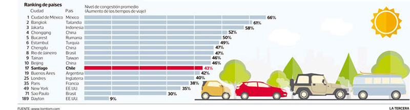 Así, TomTom ubicó a Chile en el puesto número 17 entre las ciudades con peor tráfico, con un aumento de los tiempos de viaje del 43% promedio respecto de condiciones de tránsito fluido.