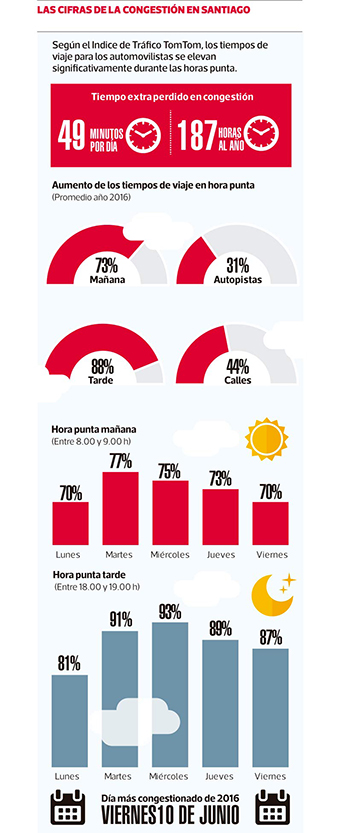 En marzo de cada año, los automovilistas de Santiago perciben cómo los tiempos de circulación de la ciudad se elevan significativamente durante las horas punta, especialmente en contraste con los meses de verano. Lo que no se sabía es que el tiempo que pueden perder arriba de un auto debido a la congestión puede alcanzar, en promedio, los 49 minutos diarios. De hecho, durante 2016, los santiaguinos pasaron 187 horas extras arriba su auto, es decir, más de una semana (ver infografía).