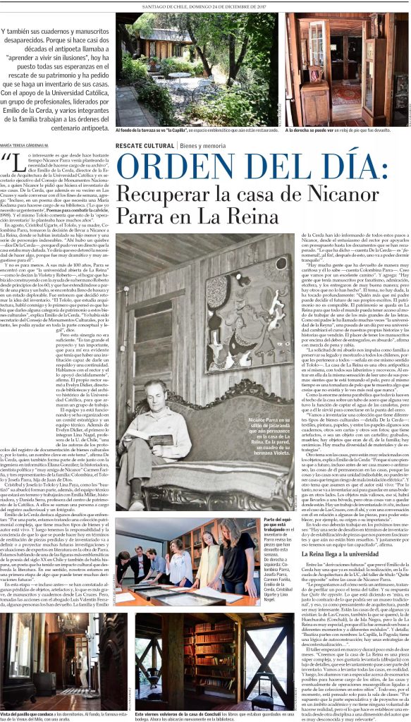 Artes y Letras de El Mercurio publica artículo sobre proyecto de rescate patrimonial de la casa de Nicanor Parra en La Reina liderado por el director de la escuela Arquitectura UC y ex secretario ejecutivo del Consejo de Monumentos Nacionales, Emilio de la Cerda. Se destaca apoyo del rector Ignacio Sánchez a la iniciativa y la participación en el equipo de Evelyn Didier, directora de Bibliotecas y del Archivo Histórico UC y de Daniela Serra, profesora del Centro de Patrimonio UC.