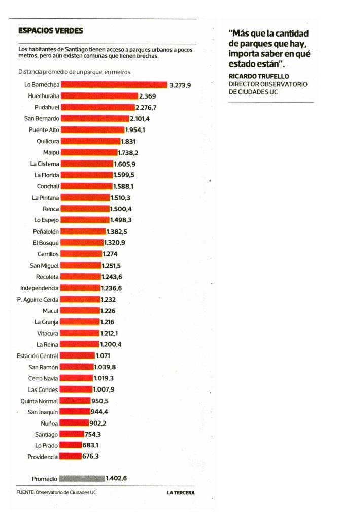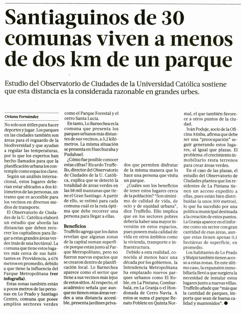 La Tercera destaca resultados de estudio del Observatorio de Ciudades que indica que santiaguinos de 30 comunas viven a menos de 2 km. de un parque. Habla Ricardo Truffello, director de la unidad.
