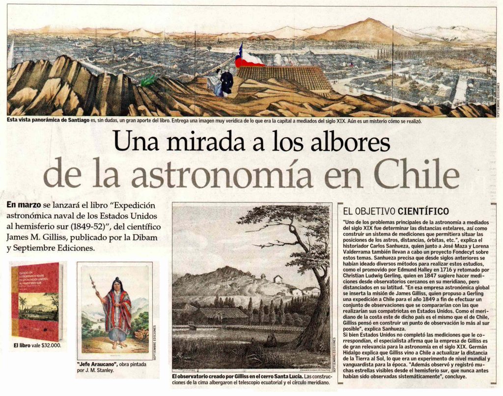 Por Marilú Ortiz de Rozas. El Mercurio destaca lanzamiento de libro Expedición astronómica naval de los Estados Unidos al hemisferio sur (1849-52), cuyo prólogo fue escrito por el profesor de la Escuela de Arquitectura, Germán Hidalgo. Habla el académico de Arquitectura y el profesor del Instituto de Historia Rafael Sagredo.