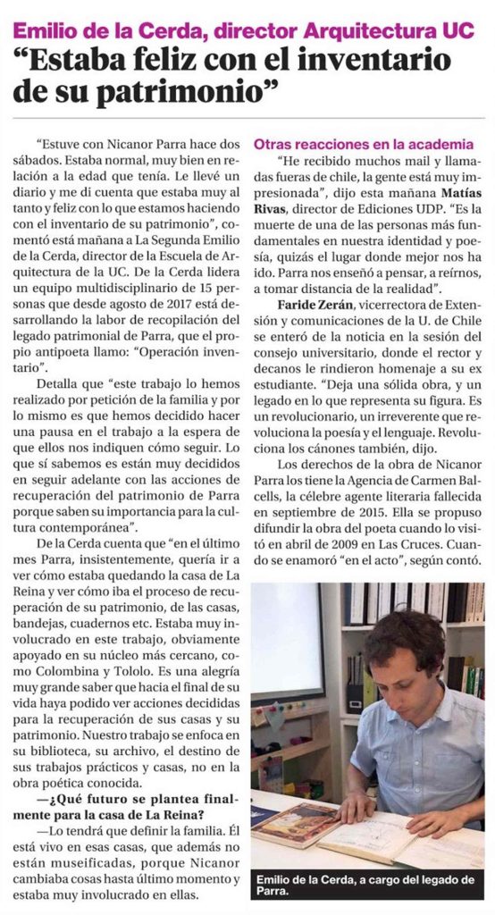 La Segunda entrevista a Emilio de la Cerda, director de la Escuela de Arquitectura, sobre el proyecto que lidera, de recopilación del legado patrimonial de Parra. La Tercera destaca este catastro de la obra del antipoeta que realiza la UC en un artículo sobre Nicanor Parra como último referente de la poesía hispanoamericana.