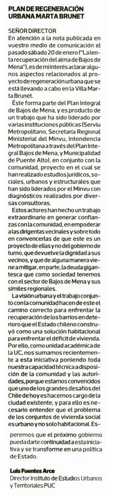 La Tercera publica carta de Luis Fuentes, director del Instituto de Estudios Urbanos y Territoriales: “Plan de regeneración urbana Marta Brunet”. + Revisa la carta aquí