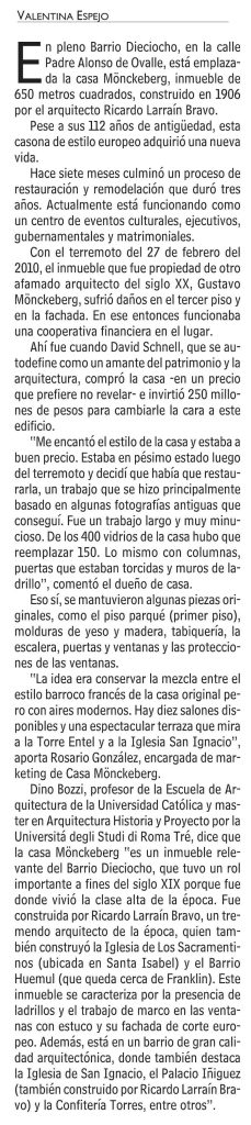 Por Valentina Espejo. Las Últimas Noticias destaca restauración de la Casa Mönkeberg en el barrio Dieciocho. Habla el profesor de la Escuela de Arquitectura, Dino Bozzi. + Revisa nota completa aquí