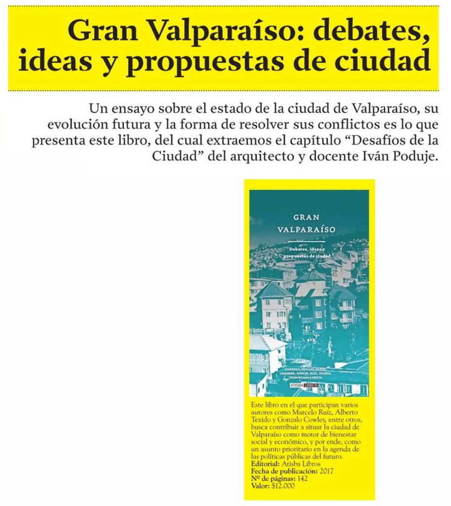 La Segunda publica el capítulo “Desafíos de la Ciudad”, del arquitecto y docente Iván Poduje, que forma parte del libro Gran Valparaíso: debates, ideas y propuestas de ciudad, en el que participan varios autores. + Revisa capitulo completo aquí.