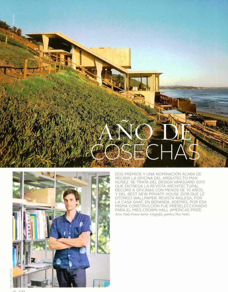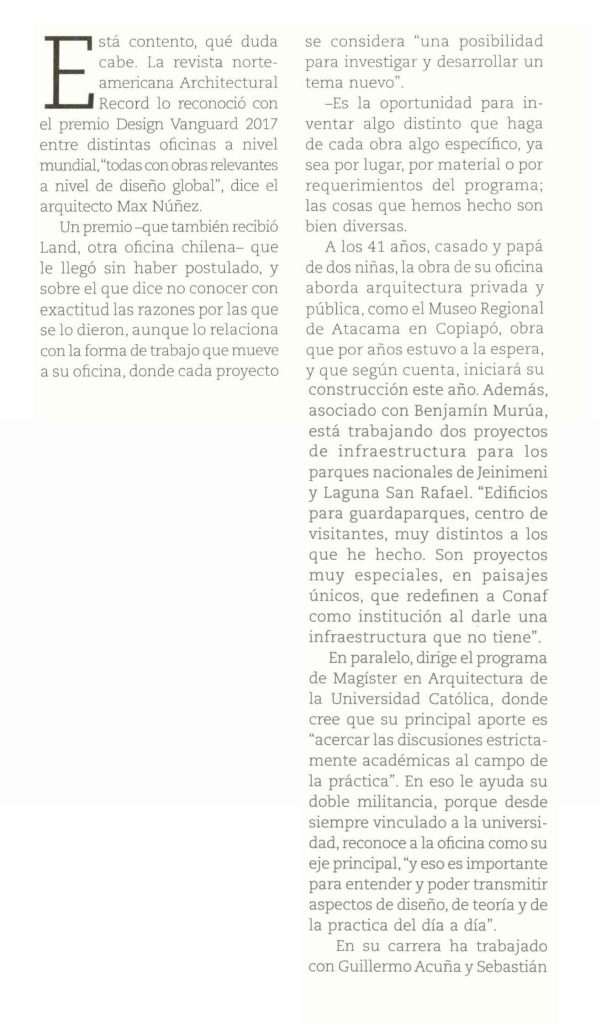 Por Paula Donoso. V&D de El Mercurio entrevista al arquitecto Max Núñez, director del programa del Magíster en Arquitectura UC, sobre los reconocimientos recibidos por su oficina.