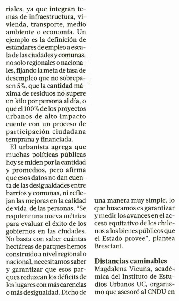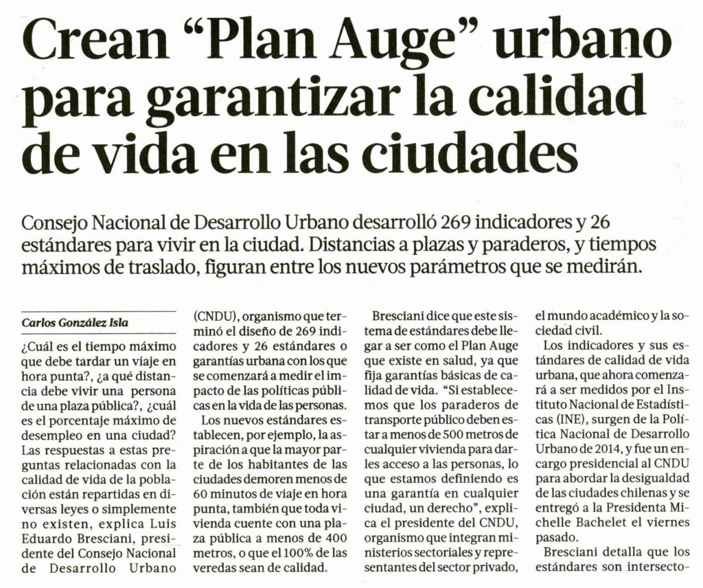 Por Carlos González Isla La Tercera destaca que crean “Plan Auge” urbano para garantizar la calidad de vida en las ciudades. Habla la profesora del Instituto de Estudios Urbanos, Magdalena Vicuña y el académico Luis Eduardo Bresciani. + Revisa reportaje completo aquí
