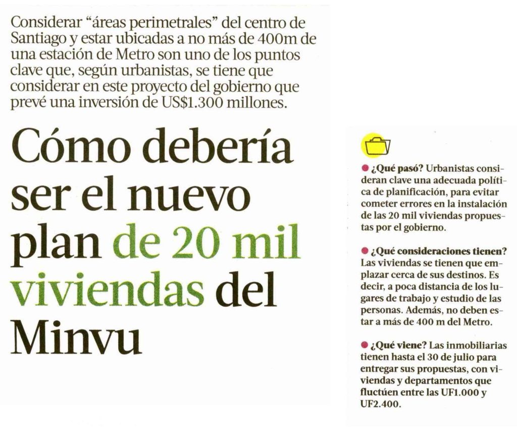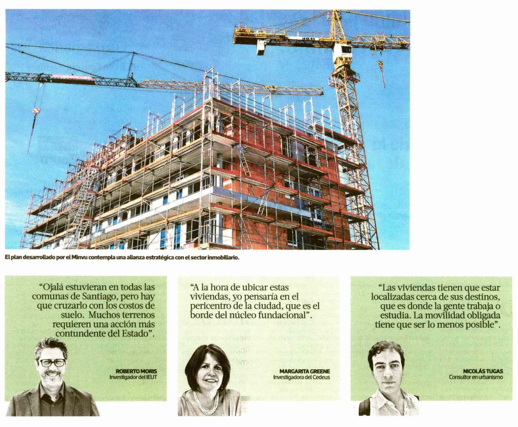 Por Efrain Moraga. La Tercera-Pulso destaca el nuevo plan de 20 mil viviendas del Minvu. Habla el profesor del Instituto de Estudios Urbanos, Roberto Morís y la académica de CEDEUS y Escuela de Arquitectura, Margarita Greene. + Revisa el reportaje completo aquí.