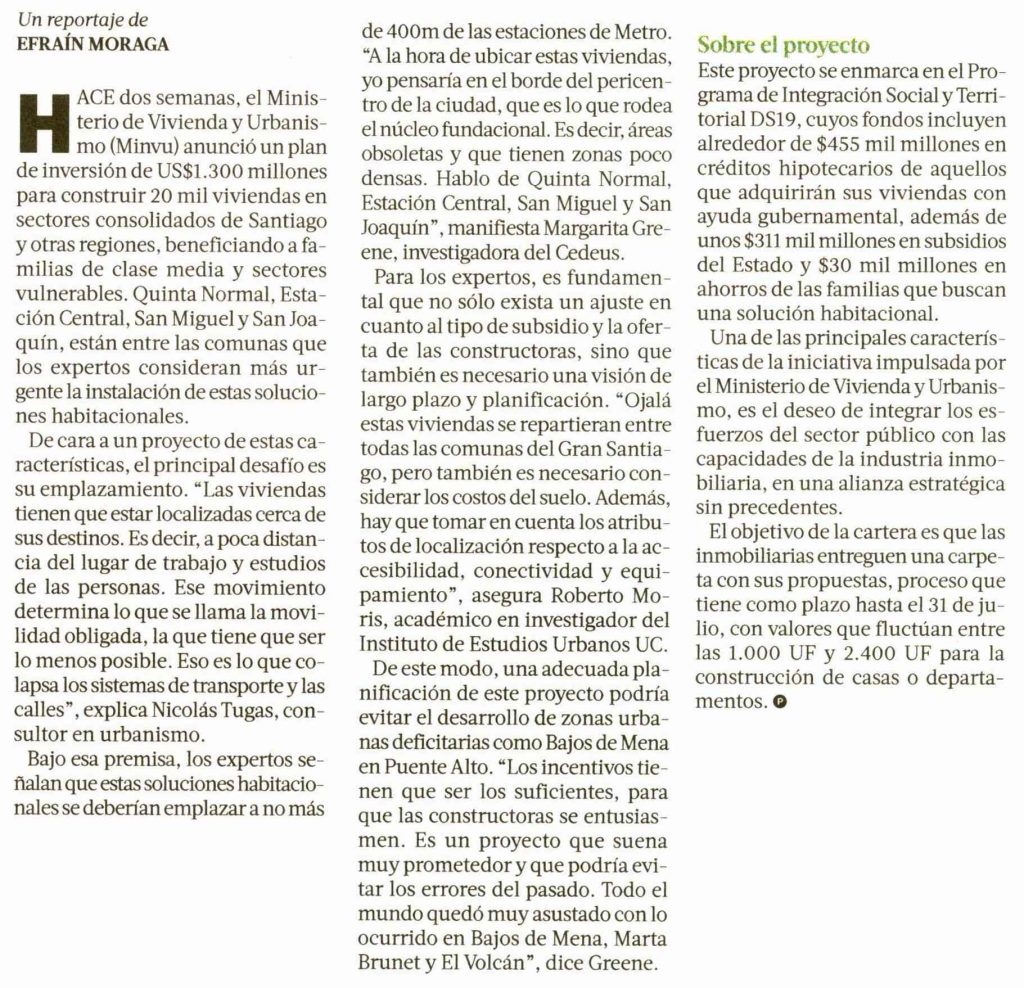 La Tercera-Pulso destaca el nuevo plan de 20 mil viviendas del Minvu. Habla el profesor del Instituto de Estudios Urbanos, Roberto Morís y la académica de CEDEUS y Escuela de Arquitectura, Margarita Greene.