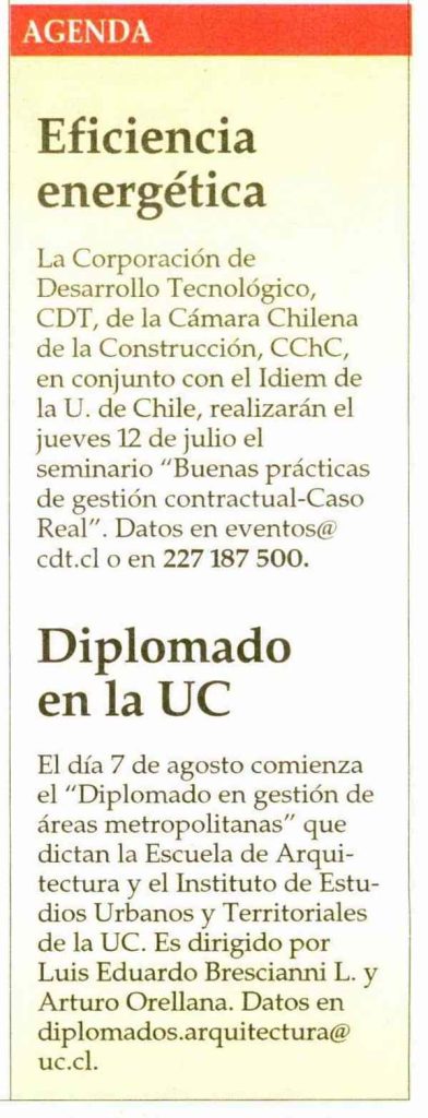 El Mercurio en Propiedades destaca que el 7 de agosto comienza el “Diplomado en gestión de áreas metropolitanas” que dicta la Escuela de Arquitectura y el Instituto de Estudios Urbanos y Territoriales de la UC.