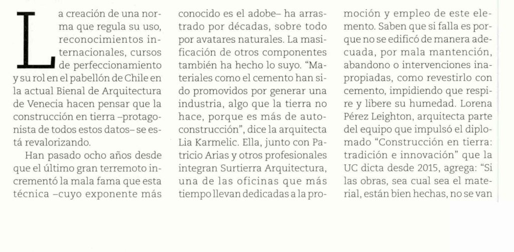 Por Claudia Pérez Fuentes Revista VD de El Mercurio publica artículo sobre la vigencia de la construcción en tierra. Habla la arquitecta Lorena Pérez Leighton, integrante del equipo que impulsó el diplomado “Construcción en tierra: tradición e innovación” que la UC dicta desde 2015.