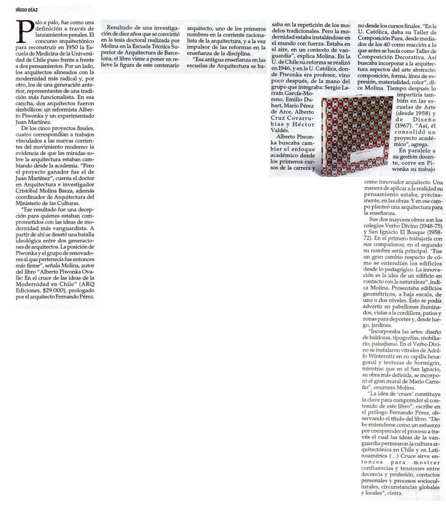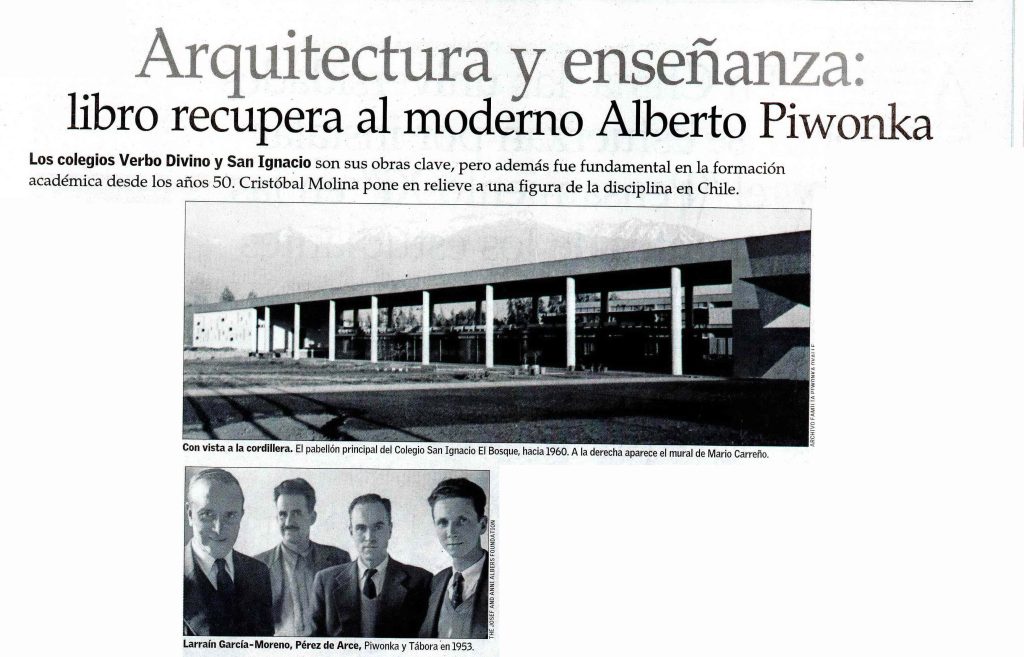 Por Iñigo Díaz. El Mercurio destaca la publicación del libro Alberto Piwonka Ovalle: En el cruce de las ideas de la Modernidad en Chile (ARQ Ediciones), prologado por el arquitecto Fernando Pérez. Se menciona que fue profesor UC.