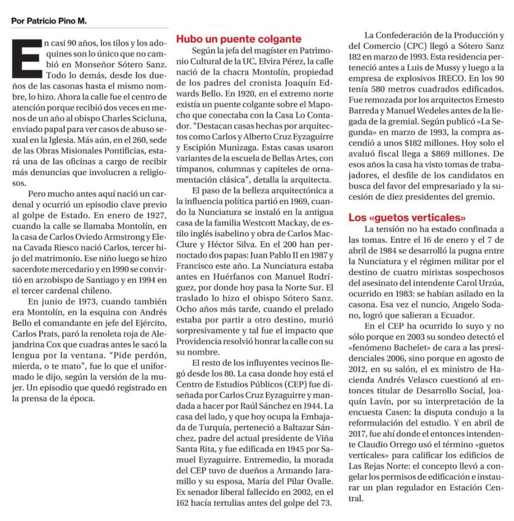 Por Patricio Pino. La Segunda publica artículo “Sótero Sanz: la adoquinada calle por donde transita el poder”. Habla la jefa del magíster en Patrimonio Cultural de la UC, Elvira Pérez. + Revisa nota completa aquí.