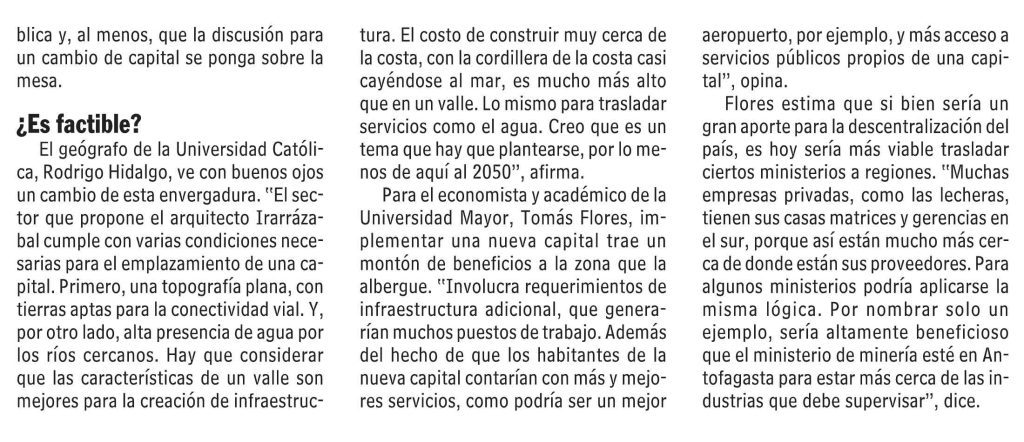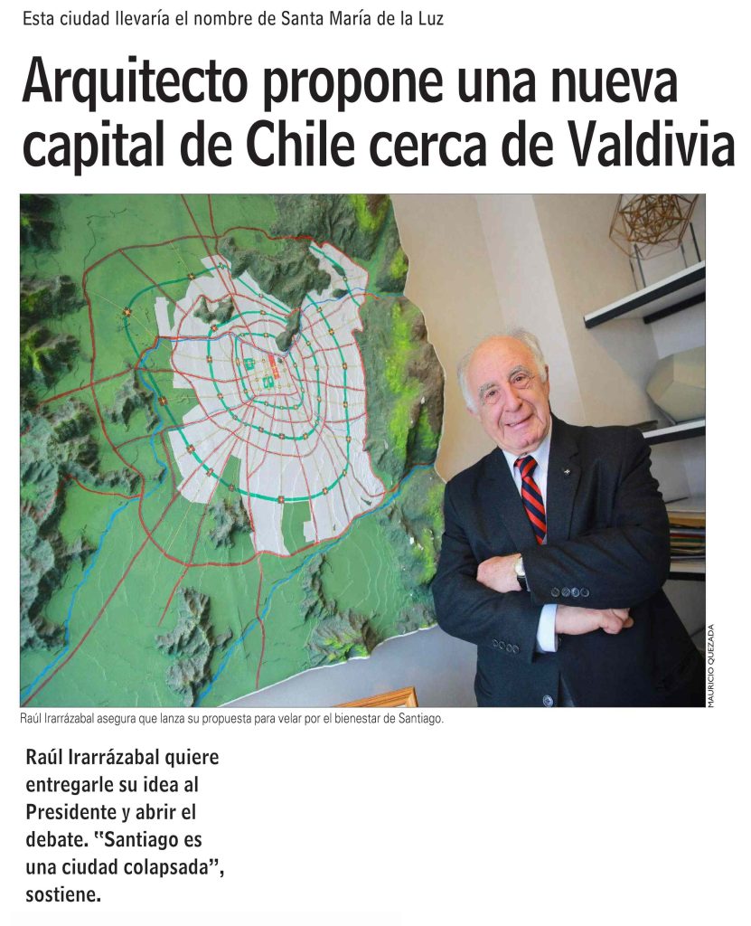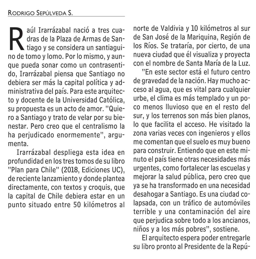 Las Últimas Noticias destaca que el arquitecto y profesor UC Raúl Irarrázabal propone una nueva capital de Chile cerca de Valdivia. Se menciona que su proyecto está desarrollado en los tres tomos de su libroPlan para Chile (2018, Ediciones UC). Habla el profesor del Instituto de Geografía UC Rodrigo Hidalgo.