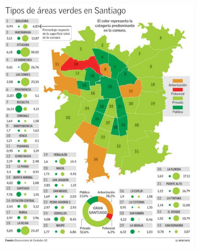 Estudio revela que la mayoría de las áreas verdes en las ciudades chilenas son privada