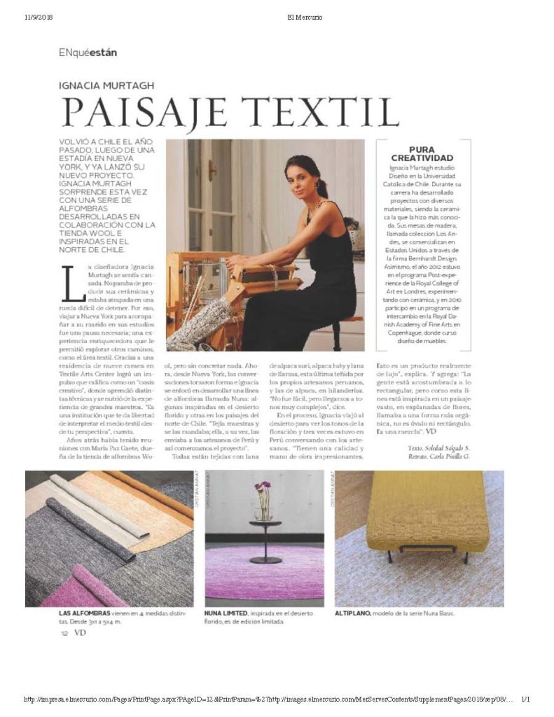 Por Soledad Salgado. La revista Vivienda y Decoración destaca a la ex alumna de la Escuela de Diseño, Ignacio Murtagh por su nuevo proyecto de alfombras. + Revisa nota completa