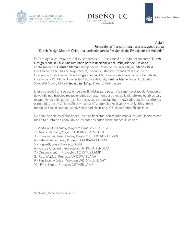 El miércoles 16 de enero, el jurado del concurso “Dutch Design Made in Chile, una luminaria para la residencia del Embajador de Holanda” realizó la selección de los diez finalistas para pasar a la segunda etapa del concurso.