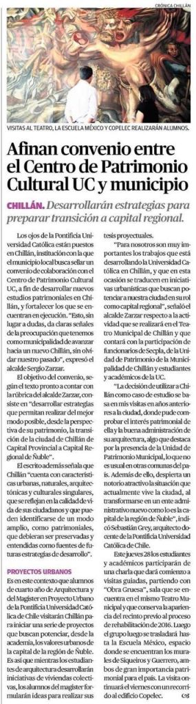 Diario Crónica Chillán destaca el Convenio de Colaboración que estamos por firmar entre la Pontificia Universidad Católica de Chile a través de su Centro de Patrimonio Cultural UC y la Municipalidad de Chillán. Uno de los objetivos del Convenio es preparar estrategias para ayudar en la transición de Chillán a la categoría de Capital Regional.