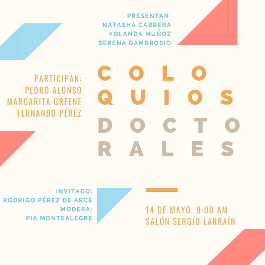 El jefe de programa del Doctorado en Arquitectura y Estudios Urbanos UC, José Rosas Vera, y el director de Investigación y Postgrado de la Facultad de Arquitectura, Diseño y Estudios Urbanos UC, Felipe Encinas, invitan al 2º Coloquio Doctoral a realizarse el 14 de mayo a las 9.00 h en el salón Sergio Larraín García Moreno.