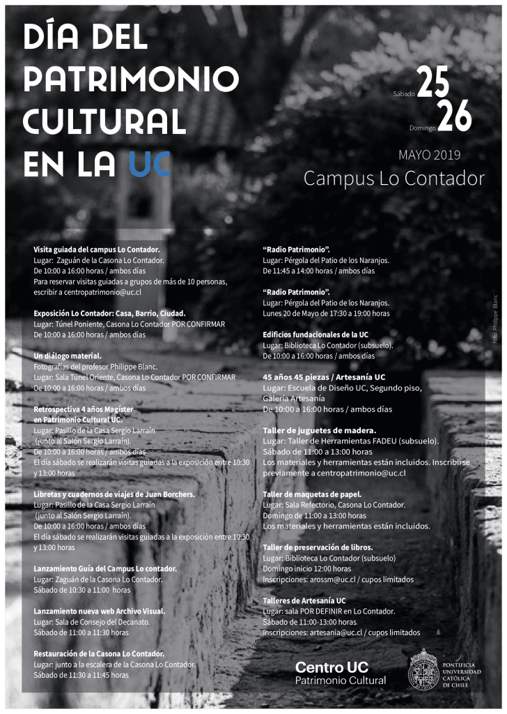 El Centro del Patrimonio Cultural de la Universidad Católica, en coordinación con Casa Central y con la Facultad de Arquitectura, Diseño y Estudios Urbanos, desarrollará los días 25 y 26 de mayo una serie de actividades y visitas guiadas a los cuatro campus que componen esta casa de estudios superiores.