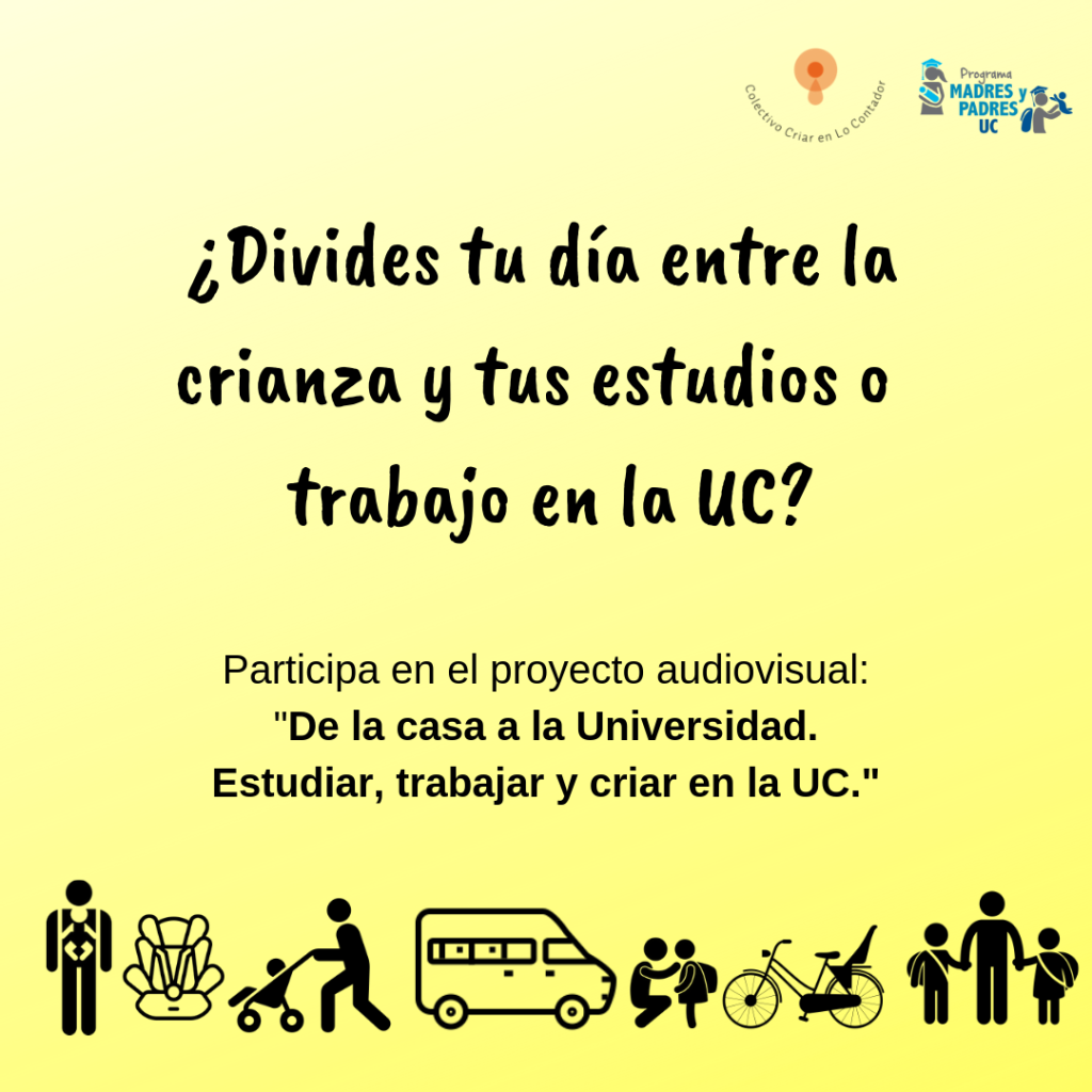 Isabel Sierralta, funcionaria de Arquitectura UC y parte del colectivo Criar en Lo Contador, y el Programa Madres y Padres UC de Salud Estudiantil les invita a ser parte del proyecto Artifica “De la casa a la Universidad. Estudiar, trabajar y criar en la UC”, que busca construir un video colaborativo que de cuenta de cómo muchos estudiantes y trabajadores de la UC logran llevar adelante su rol de madres y padres y compatibilizarlo con las responsabilidades de la vida universitaria. Están invitadas todas las personas que estudien o trabajen en cualquier campus de la UC, y especialmente los trabajadores y trabajadoras externas y subcontratadas.
