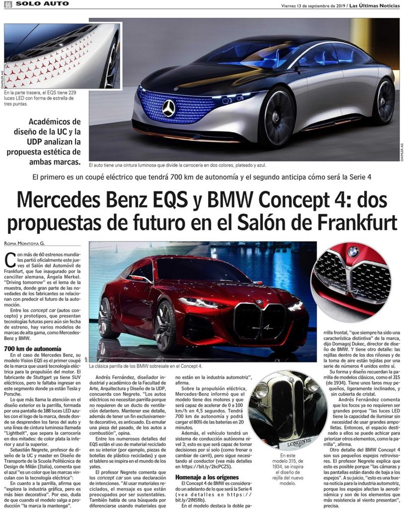 Por Roma Montoya. Profesor de la Escuela de Diseño, Sebastián Negrete es entrevistado por dos modelos de autos futuristas que estarán en el Salón del automóvil de Frankfurt. + Revisa nota completa aquí.