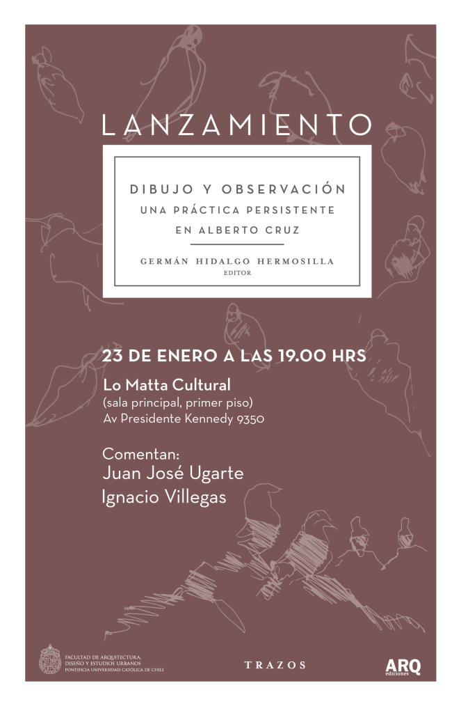 El próximo jueves 23 del presente mes a las 19.00hrs, en Lo Matta Cultural (Las Condes), Ediciones ARQ tiene considerado el lanzamiento del libro del profesor de la escuela de Arquitectura, Germán Hidalgo, titulado “Dibujo y Observación, una práctica persistente en Alberto Cruz”, que corresponde a la tercera entrega de la colección “Trazos”, y que en este caso recopila series de dibujos del reconocido arquitecto.
