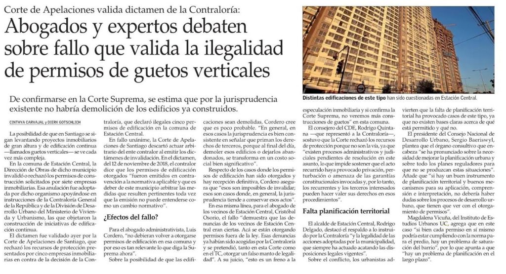 El Mercurio publica que expertos debaten sobre fallo que valida la ilegalidad de permisos de guetos verticales. Habla la profesora del Instituto de Estudios Urbanos, Magdalena Vicuña.