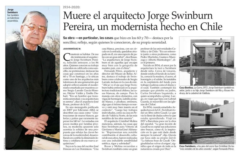 El Mercurio destaca el fallecimiento y trayectoria del arquitecto Jorge Swinburn. Comentan los académicos de la Escuela de Arquitectura, José Rosas y Fernando Pérez. + Revisa nota completa aquí.
