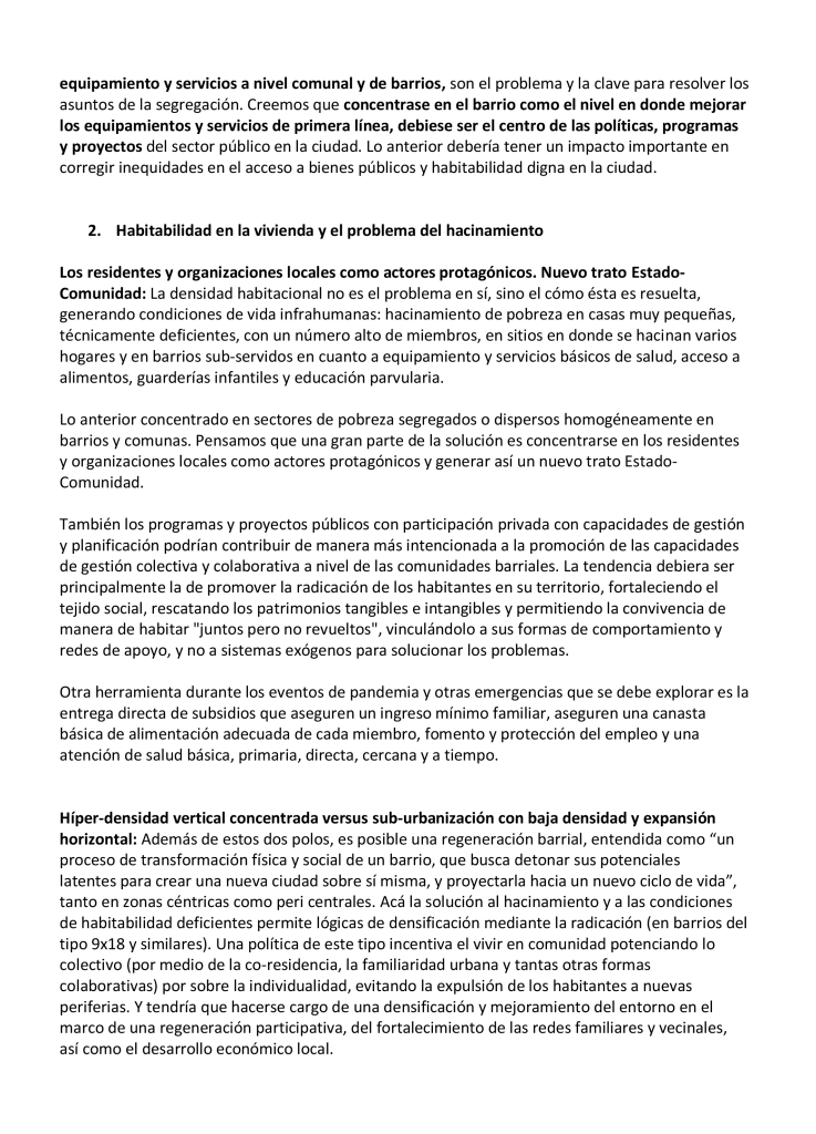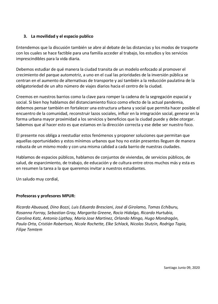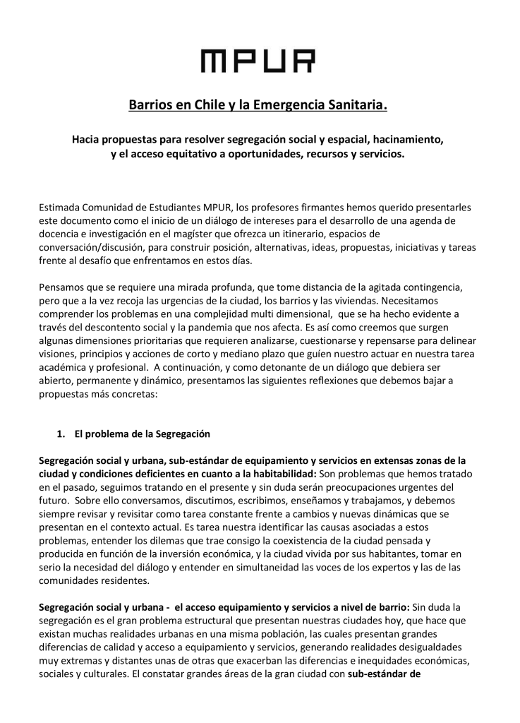 Carta abierta del Magíster en Proyecto Urbano de la Escuela de Arquitectura: “Hacia propuestas para resolver segregación social y espacial, hacinamiento, y el acceso equitativo a oportunidades, recursos y servicios”.