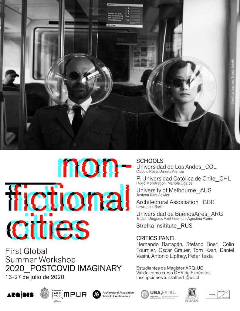 La Escuela de Arquitectura UC participará del First Summer Global Workshop: NON FICTIONAL CITIES Post Covid Imaginary, que se realizará entre el 13 y el 27 de julio de 2020 al alero del Magíster de Proyecto Urbano (MPUR) y estará dirigido a estudiantes de magíster. El trabajo de los estudiantes participantes de nuestra escuela será guiado por el profesor Hugo Mondragón y Manola Ogalde, y será evaluado por un jurado internacional del que Antonio Liphtay, director del MPUR, formará parte.