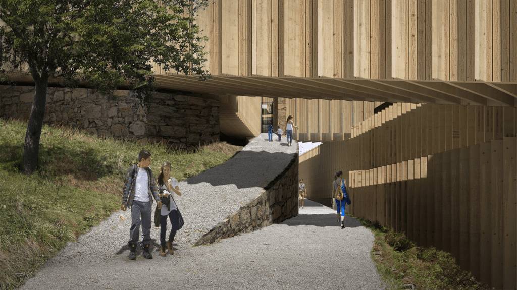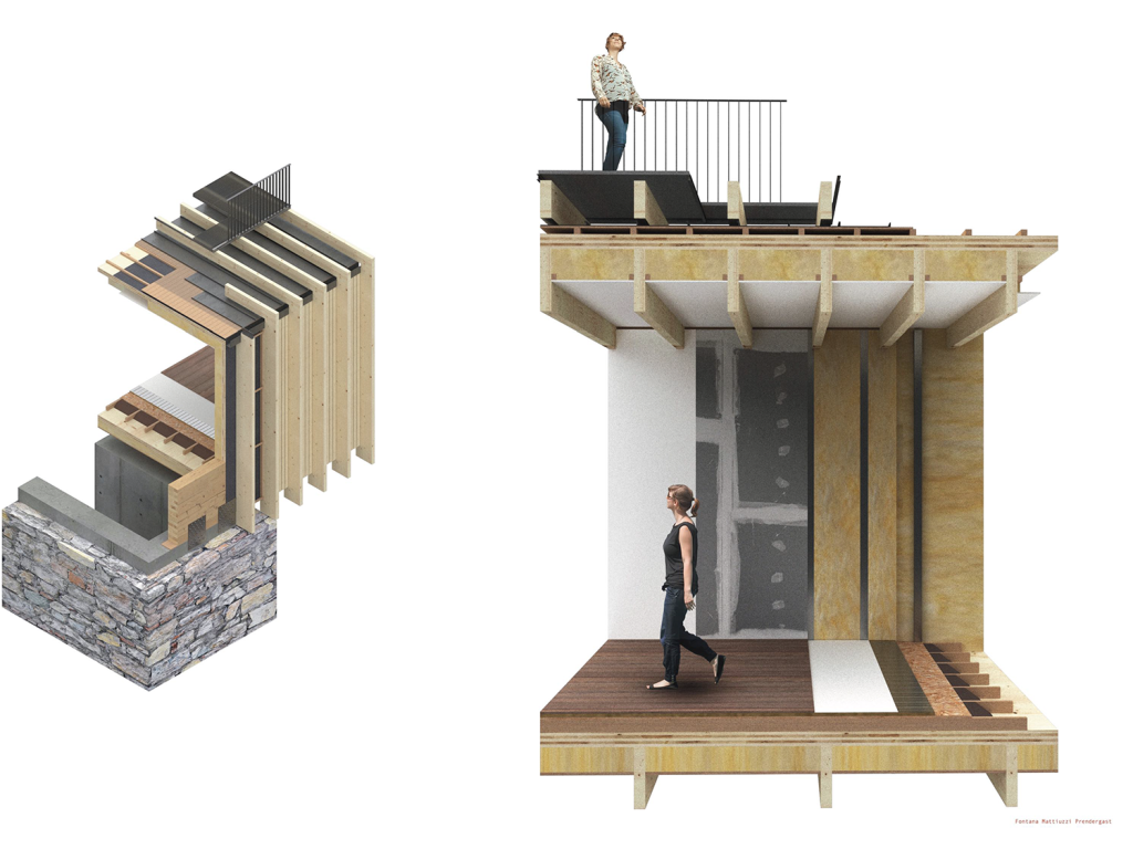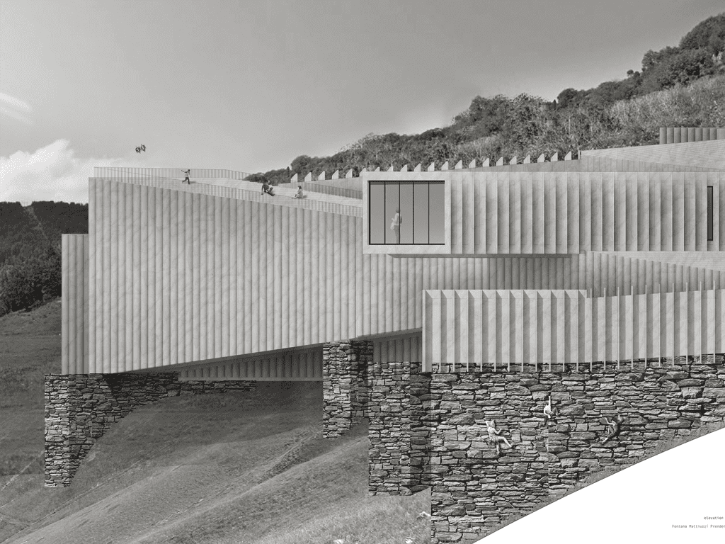 Para ello, debieron colocar lo corporal en el centro del diseño, examinando cómo las formas y los materiales afectan el estado de ánimo de las personas, su sensación de seguridad o inquietud y cómo la luz y el color, la acústica, la ventilación e incluso la percepción cognitiva del espacio y la forma se puede organizar para lograr el bienestar, el confort y el placer antes mencionados. El sistema constructivo fue en base a maderas laminadas y paneles contrachapado del tipo CLT. El lugar escogido fue el área de antigua presa en desuso llamada Vajont, ubicada a 100 km de Venecia.