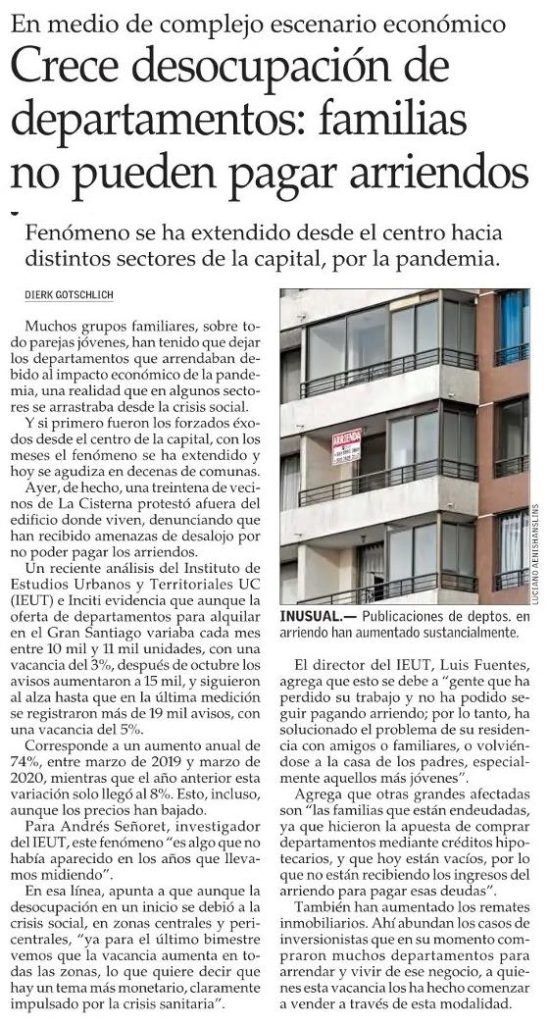 El Mercurio publica que muchos grupos familiares, sobre todo parejas jóvenes, han tenido que dejar los departamentos que arrendaban debido al impacto económico de la pandemia. Se destaca análisis del instituto UC e Inciti sobre el tema. Habla el investigador Andrés Señoret y el director del IEUT, Luis Fuentes. + Revisa la nota completa aqui.