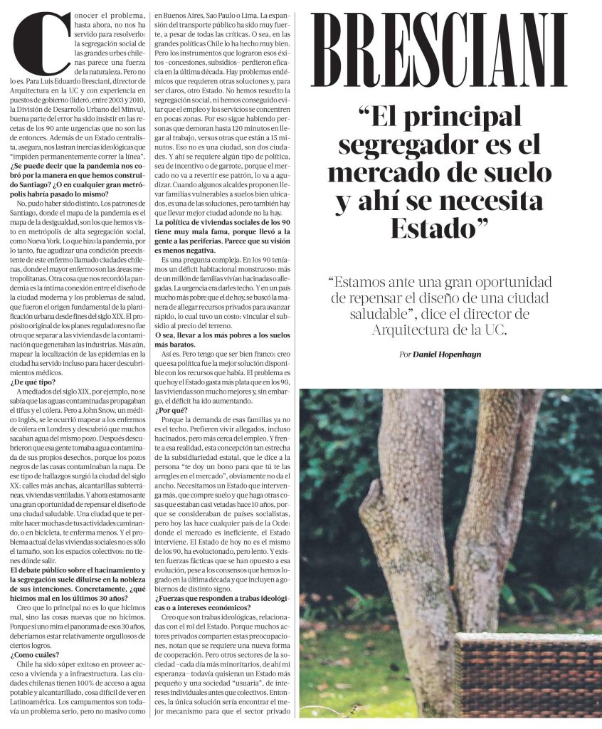 La Tercera entrevista a Luis Eduardo Bresciani, director de la Escuela de Arquitectura, sobre la segregación social de las ciudades chilenas.